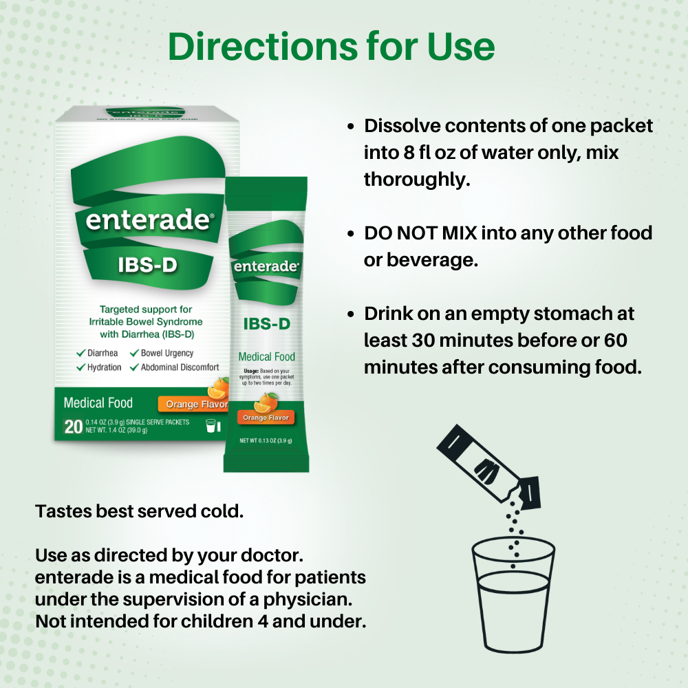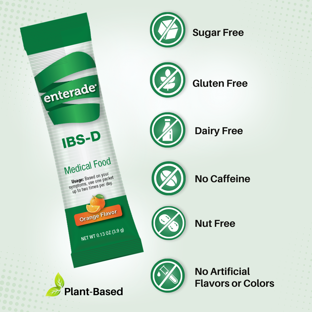 enterade IBS-D is a medical food for patients under the supervision of a physician. It can be sued with a Low FODMAP diet and/or gluten-free diet for more symptom control.