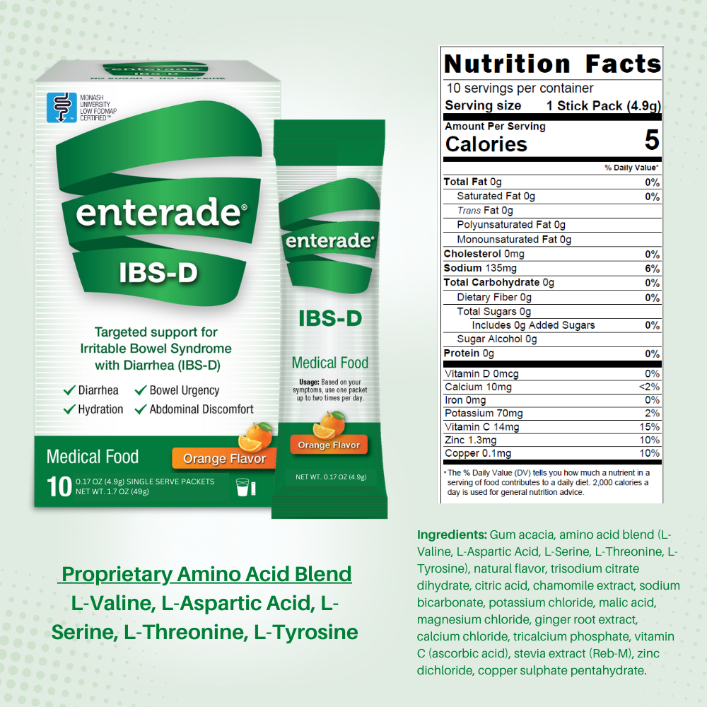 - Over 10 years to Develop, Working with Gastroenterologists and Dietitians. enterade IBS-D is based on the discovery that precise combinations of amino acids at specific levels can deliver targeted GI benefits. The formula contains a patented blend of amino acids, plus electrolytes and minerals